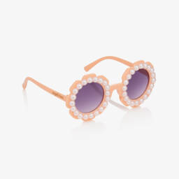 Stylish pale pink sunglasses for girls by French fashion house, Chloé. The tinted purple lenses have a category 3 filter, providing high protection against sun glare. The gold logo branding on one arm adds a touch of luxury. They come with a protective zip-fastening branded pouch and matching care cloth.