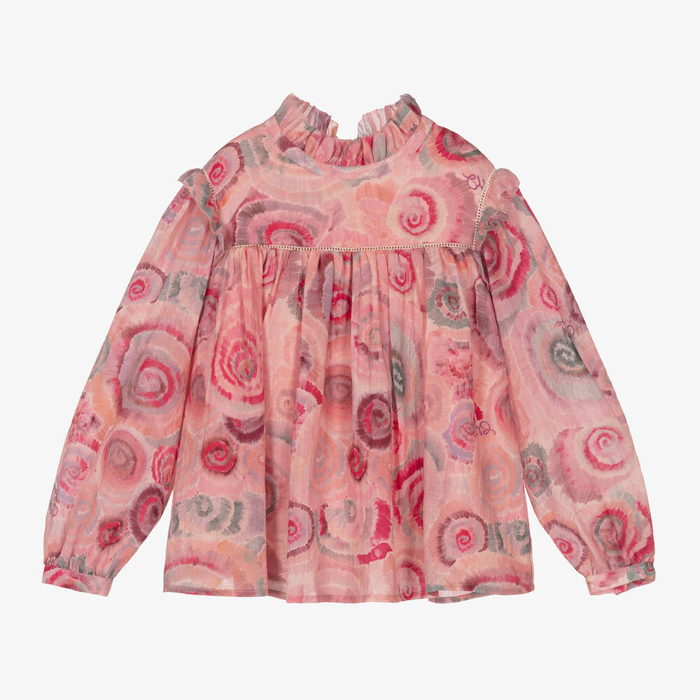 Pretty pink blouse for girls by luxury designer, Chloé. Softly woven in lightweight wool with a comfortable cotton lining, it has ruffle trims, a high neckline and long, puffed sleeves. Intricate cut-work detailing elevates this beautiful piece. It fastens smoothly with a discreet, concealed zip on the back.