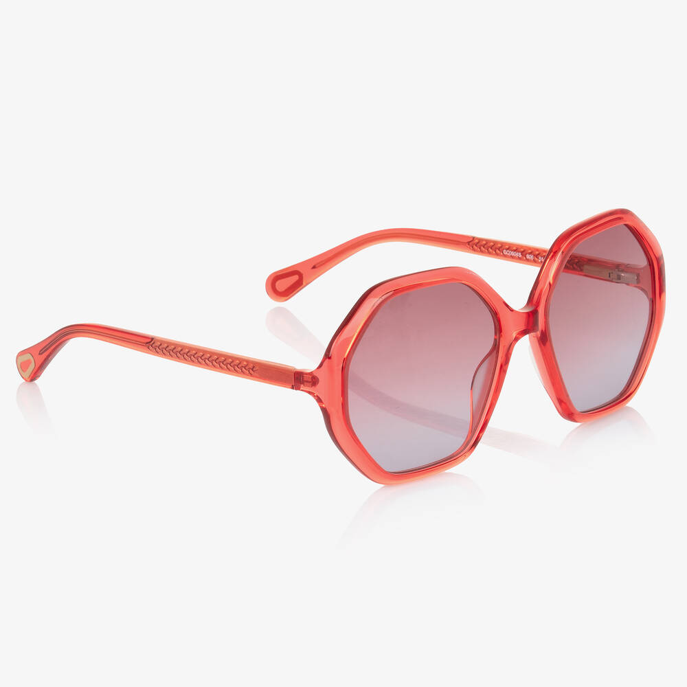 Clear red sunglasses for girls by luxury French designer Chloé, featuring the brand's iconic hexagonal-shaped frame. They have stylish gradient lenses with a category 2 filter, providing good protection against sun glare. They have braided detailing on the side and a gold logo on the left temple. The sunglasses come in a branded protective carry case with a matching care cloth.
