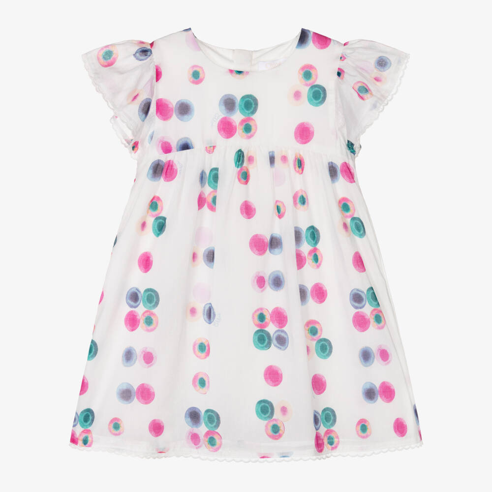 A charming white Mini-me dress for little girls by luxury French fashion house Chloé. It is made in semi-sheer, organic cotton voile, with a delicate, embroidered scalloped trim around the hem and pretty flutter sleeves. The fabric has a colourful, watercolour-inspired, circular, fusion print in shades of pink, blue and green, subtly incorporating the designer's signature logo in blue. This lovely dress is fully lined for comfort and fastens discreetly with a concealed zip on the back.