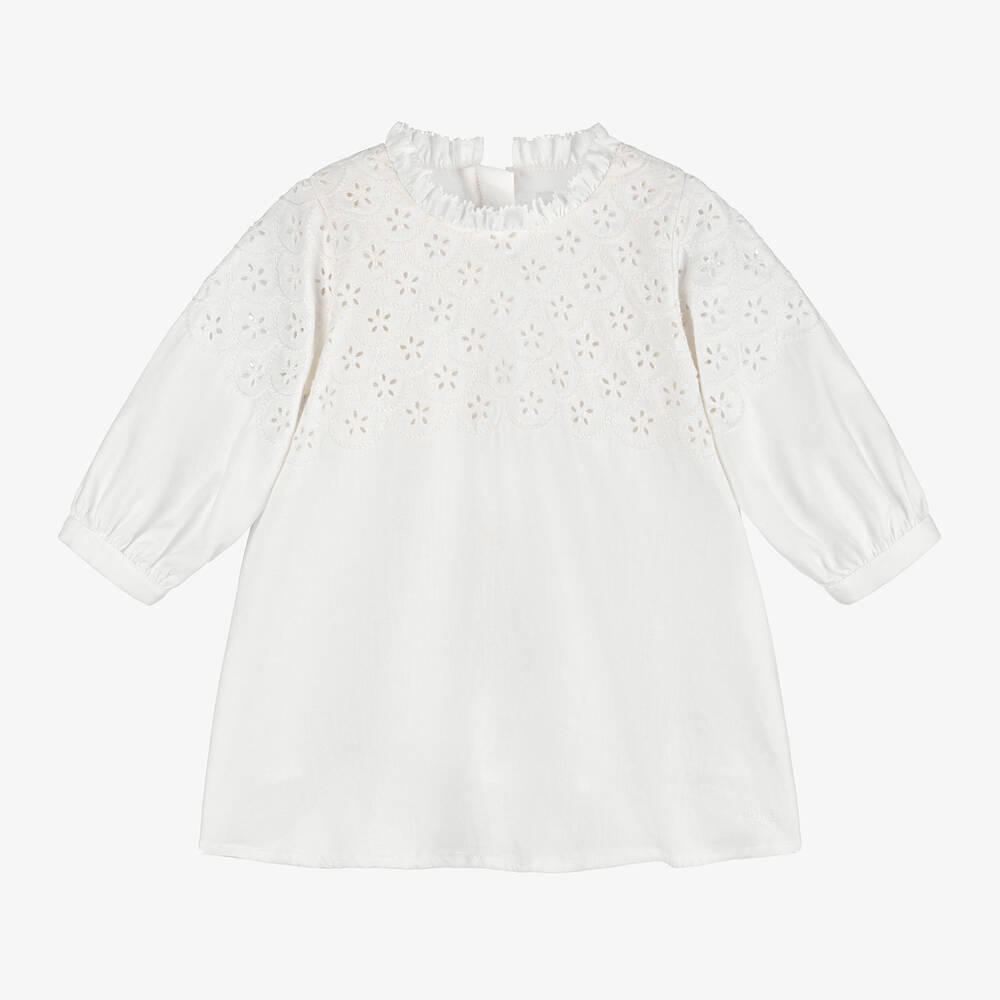 White organic cotton dress for little girls by luxury French fashion house Chloé. It has a sweet, stand-up collar with an embroidered trim and beautiful floral cut work with scalloped embroidery. Fully lined in cotton voile, it has a subtle logo by the hemline and a neat, concealed zip fastening on the back.