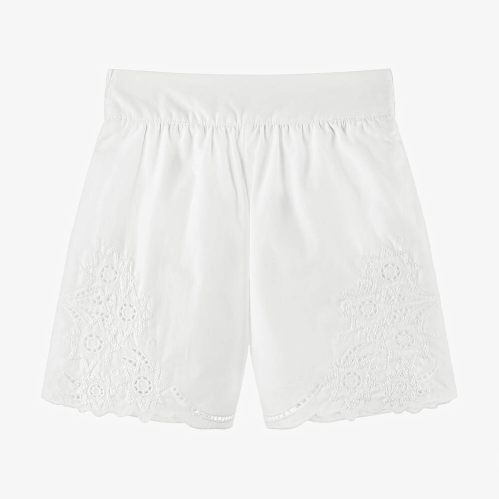 A pair of shorts in off-white for girls by Chloé, a style inspired by the adult collection. Renowned for their delicate, intricate detailing, the luxury fashion house has designed these elegant shorts with tonal star embroidery, scalloped edges, and cutwork. These organic cotton shorts have a voile lining and part-elasticated waist, so soft and gentle on the skin for the warmer months. Hidden side pockets and subtle Chloé logo embroidery on the back completes the understated look.