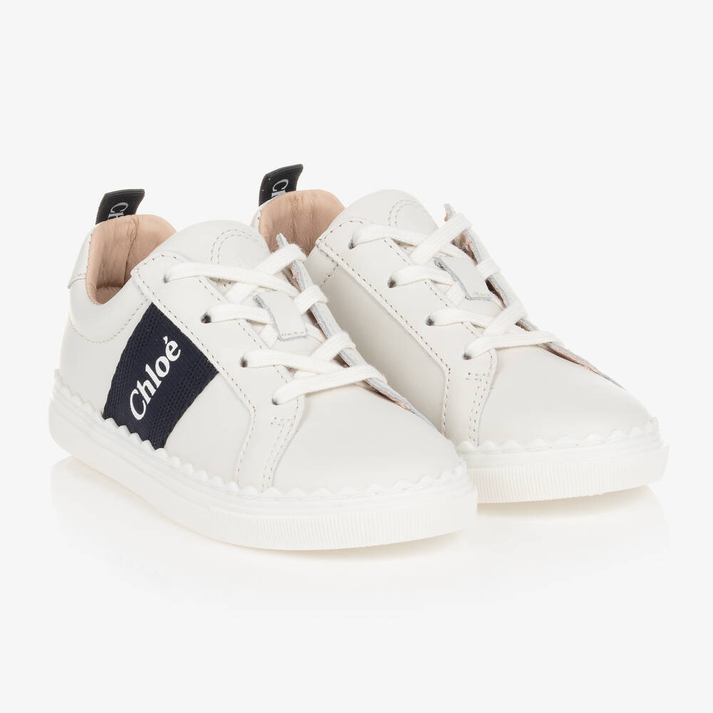 Mini-me off-white leather trainers for girls by luxury French brand, Chloé. Lace fastening, they have navy blue woven tape trim on the side and heel, with white logo print, and an embossed logo on the tongue. They are lined in soft leather and have flexible white soles with the designer's signature scallop trim to complete the look.