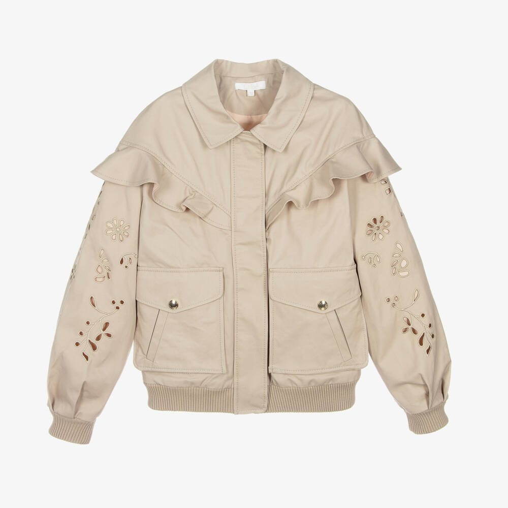 Gorgeous Mini-me beige jacket for teen girls by luxury French brand Chloé. So lovely and chic to wear for transitioning seasons, it has pretty ruffles, beautiful cut-out embroidery on the puffed sleeves and branded golden poppers. Made in soft cotton twill and fully lined, it has ribbed jersey cuffs and hem with a practical zip fastening neatly tucked under the front placket. There are two large front pockets with cute slide pocket inserts.