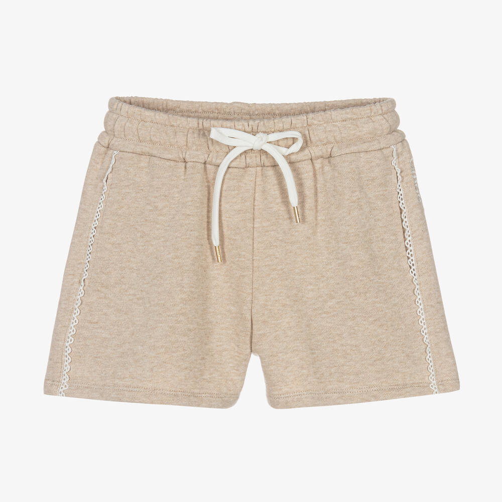 Casual marl beige jersey shorts for teen girls by French brand Chloé. They have pretty trims on the sides made from delicate guipure lace and the Chloé signature logo embroidered in ivory on one side. Made in soft organic cotton sweatshirt jersey, they have an ivory drawstring on the elasticated waist for an adjustable fit and pockets on the side seams.