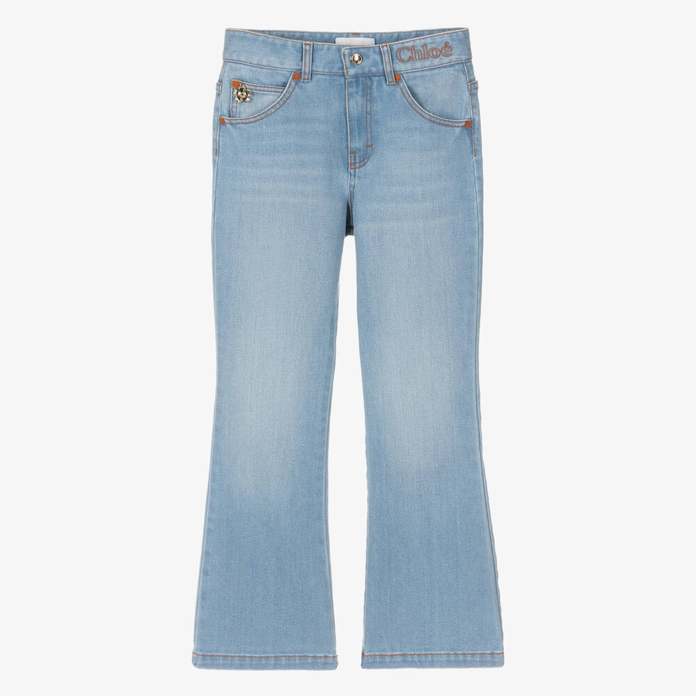 Light blue wash flared denim jeans for teen girls by luxury designer Chloé, inspired by the main collection. The French fashion house's signature logo is embroidered on the front to match the contrast dark yellow stitching. Further designer details include a golden Chloe flower on the coin pocket and a zip fastening with a branded gold tone popper. This classic five pocket style has intentional faded patches for a cool finish.