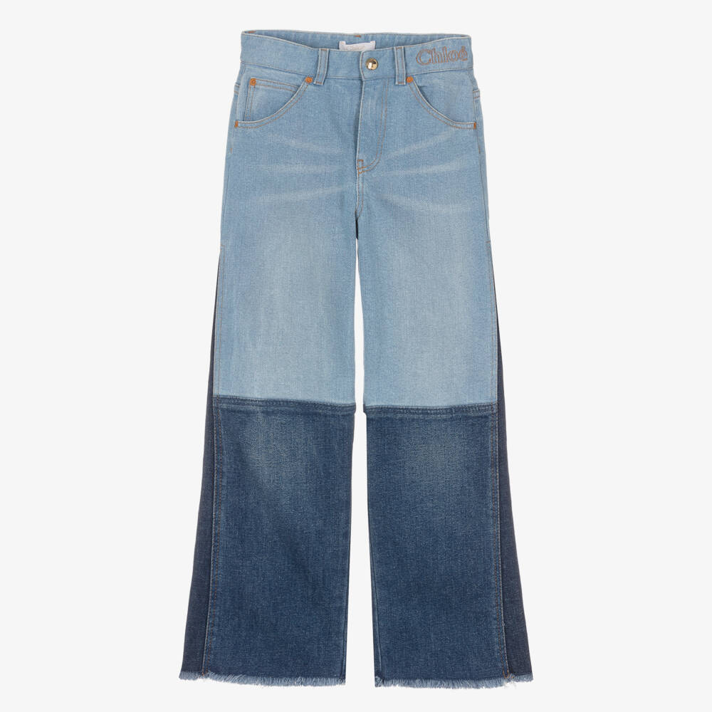These blue jeans for teen girls are a design inspired by the Chloé adult collection. With patchwork styling, they are panelled in tones of blue and trimmed with frayed edges on the hem for a touch of cool bohemianism. In a golden brown hue, the luxury label's signature logo is embroidered on the front of the waist to complement the stitched rivets. These slightly flared jeans are made in cotton-rich denim, with five useful pockets and a zip and gold-tone branded popper on the front.