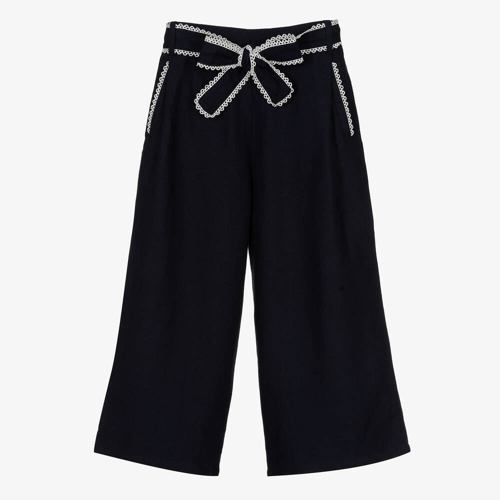 Super stylish navy blue Mini-me trousers for teen girls by luxury French designer Chloé, with wide legs. Made in a linen and cotton twill blend, they have pretty, embroidered ivory Guipure lace trims on the attached front sash and jetted pockets. The waistband is elasticated around the back for a comfortable fit and has a subtly embroidered logo on one side.