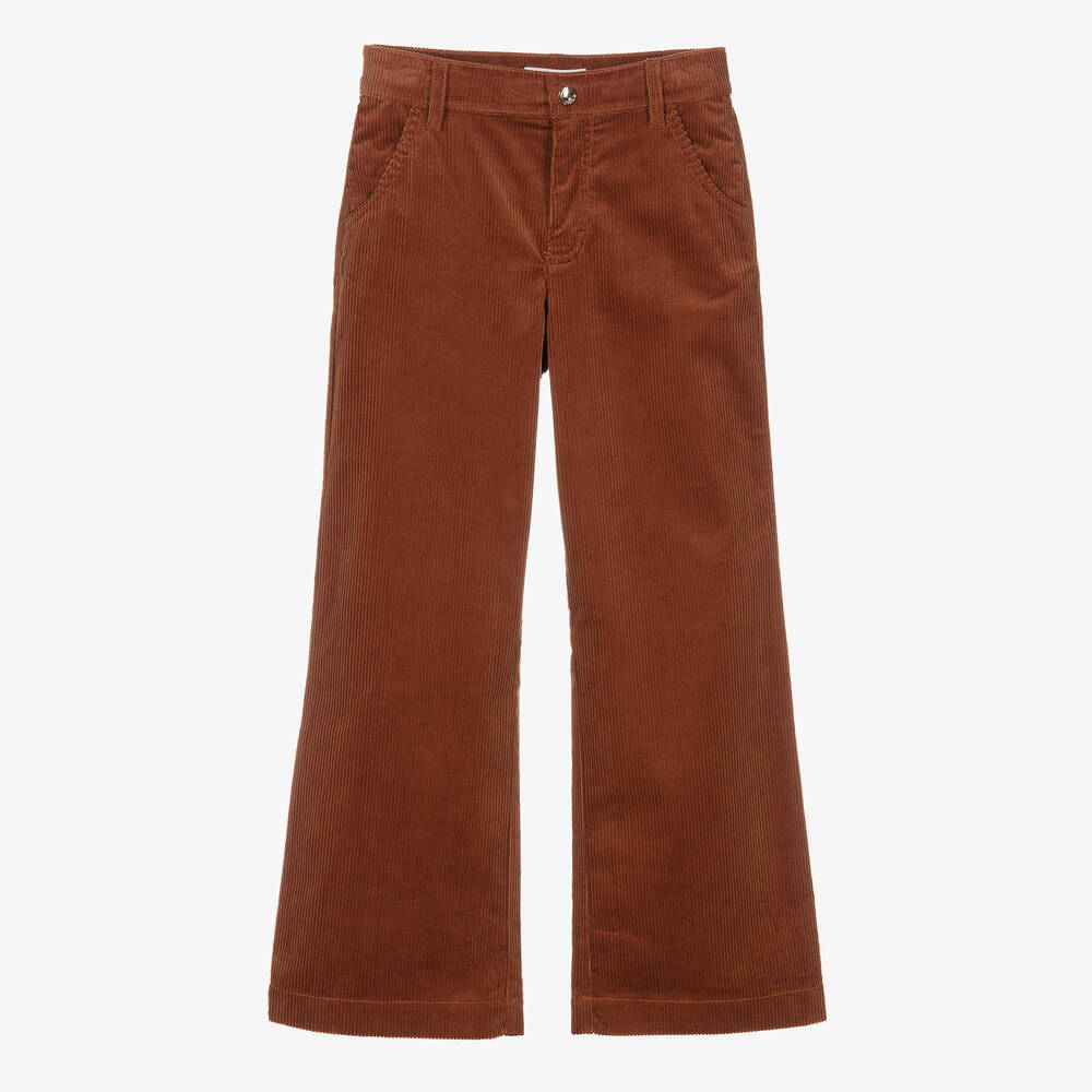 Brown corduroy trousers for teen girls by luxury French brand Chloé, with distinctive tonal embroidery on the back pocket and the label's signature flower motif. Great for bohemian-inspired looks, these wide leg trousers have four-pocket detailing and useful belt loops on the waist. Made from soft cotton with a gentle stretch, they fasten with a branded popper and zip on the front.