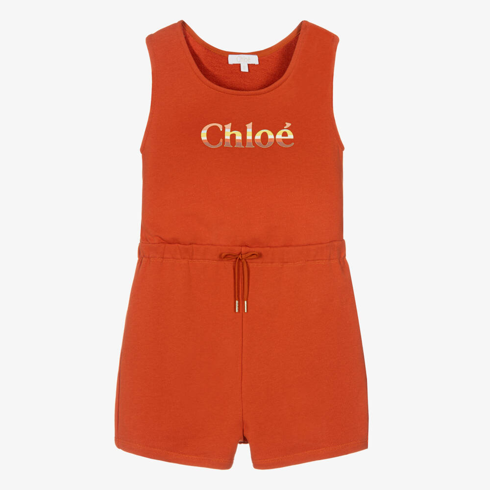 Casual burnt orange playsuit for teen girls, unmistakably by luxury French brand Chloé, with it's colourful, gradient logo printed on the front, edged in shiny gold. It has an elasticated waist with a faux drawstring, finished in shiny gold logo end caps, and an open back. Made in comfortable, stretchy, sweatshirt jersey, it has popper fastenings on one shoulder and useful, concealed pockets on the side seams.
