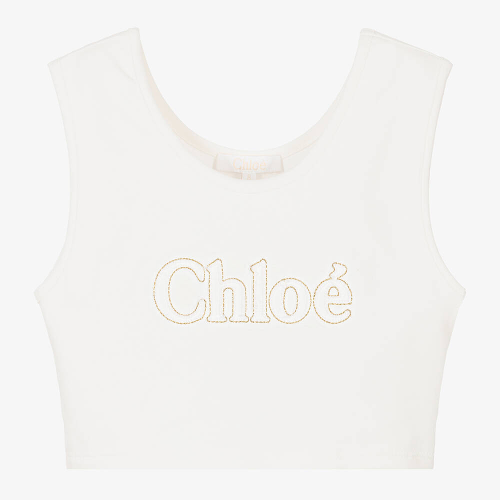 Cropped ivory sleeveless vest top for teen girls by luxury French designer Chloé, with an eye-catching embroidered logo on the front in white and glittery gold. Made in soft, comfortable organic cotton jersey, it is ideal for adding a stylish, designer touch to casual wardrobes.