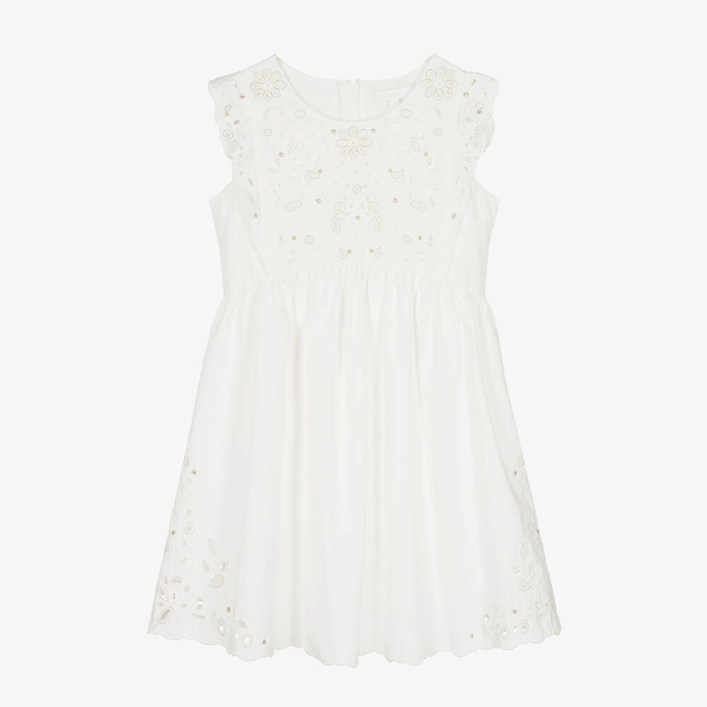 Gorgeous ivory organic cotton dress for teen girls by luxury French designer Chloé, inspired by the main collection. The front panel, shoulder ruffles and corners of the scalloped hem have beautiful floral broderie anglaise, sparkling with gold thread. Made in soft poplin, it has the brand's signature logo is subtly embroidered on one side. It is fully lined for comfort and fastens with a neat, concealed zip around the back.