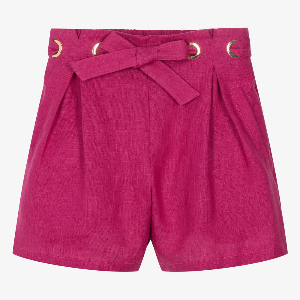 Gorgeous smart-casual magenta pink linen shorts for teen girls by luxury French fashion house Chloé. Beautifully tailored with inverted pleats on the front and pockets, this easy slip-on style is elasticated around the back for a comfortable fit. The front waist has a fabric sash that ties in a bow, with large gold-tone eyelets, a signature look for the brand. For a discreet designer touch, there is a tonal logo embroidered on the back.
