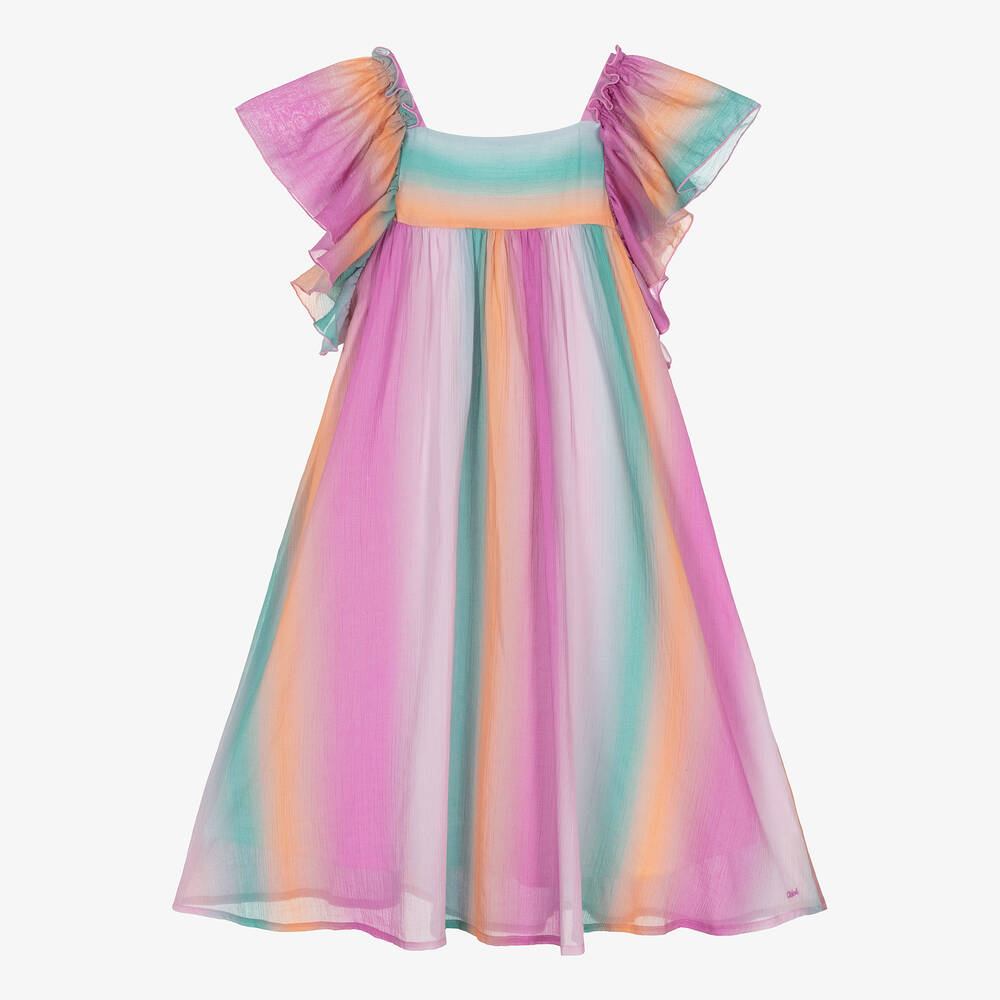 Elegant magenta pink cotton maxi dress by luxury French label Chloé, designed for teen girls with signature logo embroidery. It has an ombré pattern, frilly elasticated sleeves and a flowy silhouette for a dreamy bohemian style. The lightweight crinkled fabric falls beautifully to the ankle and the back is effortlessly elasticated. It is finished with a cotton voile lining.
