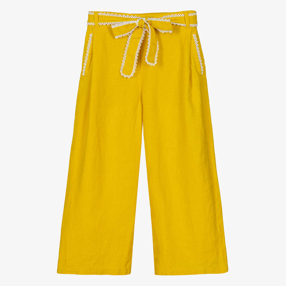Super stylish mustard yellow cropped trousers for teen girls by luxury French designer Chloé, with wide legs. Made in lightweight linen, they have pretty, ivory guipure lace trims on the attached front sash, with matching jetted pockets. The waistband is elasticated around the back for a comfortable fit and has a subtly embroidered logo on one side.