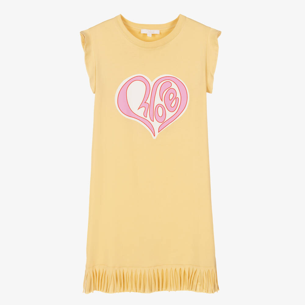 Pale yellow T-shirt dress for teen girls by luxury French brand Chloé, made in soft and stretchy organic cotton jersey. The front is printed with a white and pink Chloé Hearty logo print on the front. Ruffle sleeves and a pretty fringed hemline complete this casual dress.