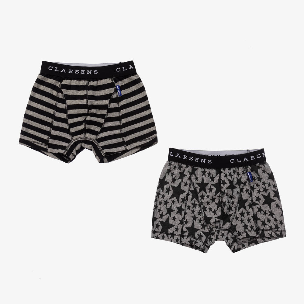 Pack of two black and grey boxer shorts for boys by Claesen's, made in soft cotton jersey. One pair are striped, while they other has a fun star print. These comfortable boxers have the brand's logo on the waistband for added designer appeal.