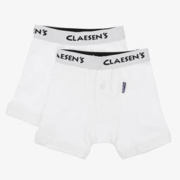 Pack of two navy blue boxer shorts for boys by Claesen's, made in soft cotton ribbed jersey. Comfortable to wear, they have an elasticated waistband, with a repeat logo in black and button front fastenings.