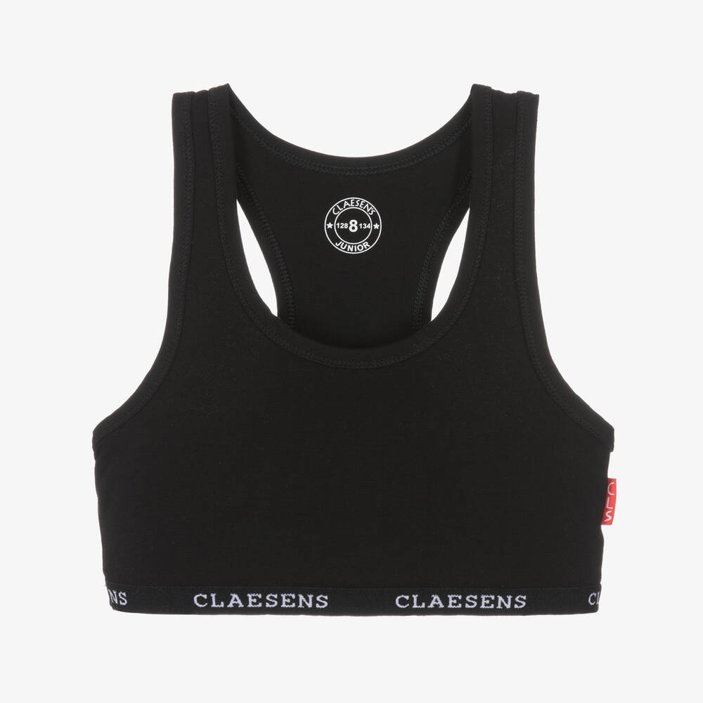 Girls black bra top by Dutch brand Claesen's, made in soft and stretchy cotton jersey. It has a sporty racer back and an elasticated logo band for extra comfort.