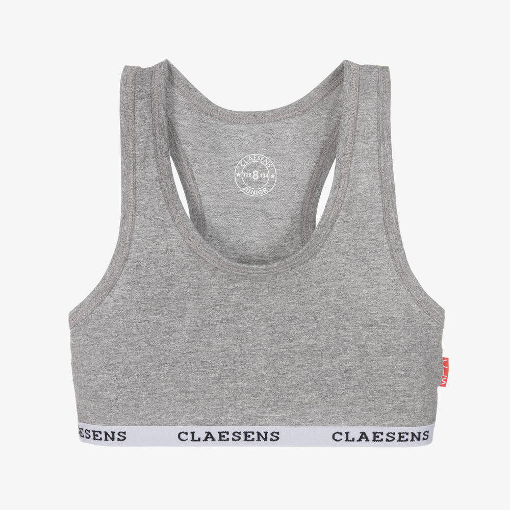 Girls grey cropped top by Dutch brand Claesen's, made in soft and stretchy cotton jersey. It has a sporty racerback and an elasticated logo band for extra comfort.