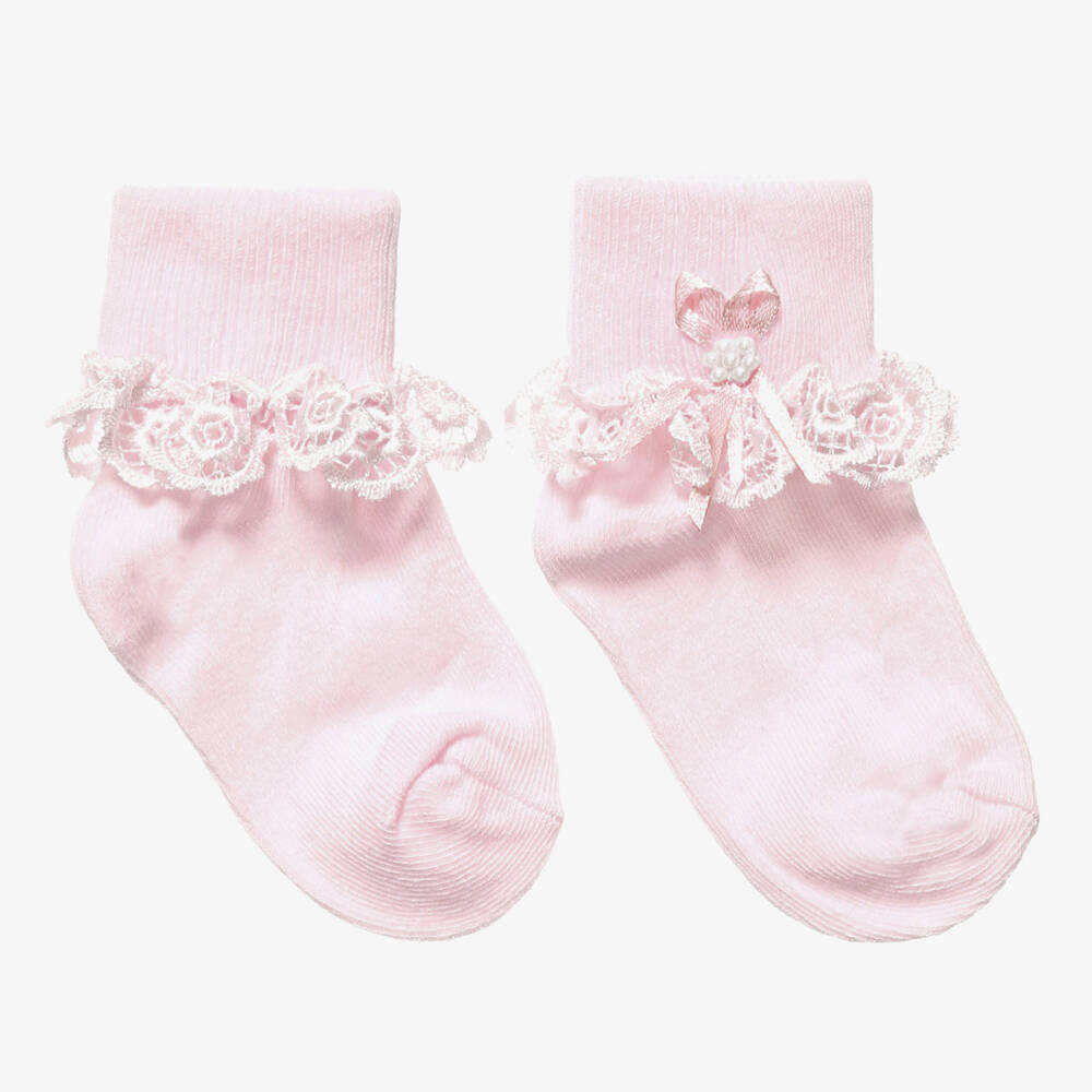 Pink cotton blend socks for girls by Country Kids, with a detailed lace trim around the ankle. Little satin ribbon details are stitched on the sides with beads on top.
