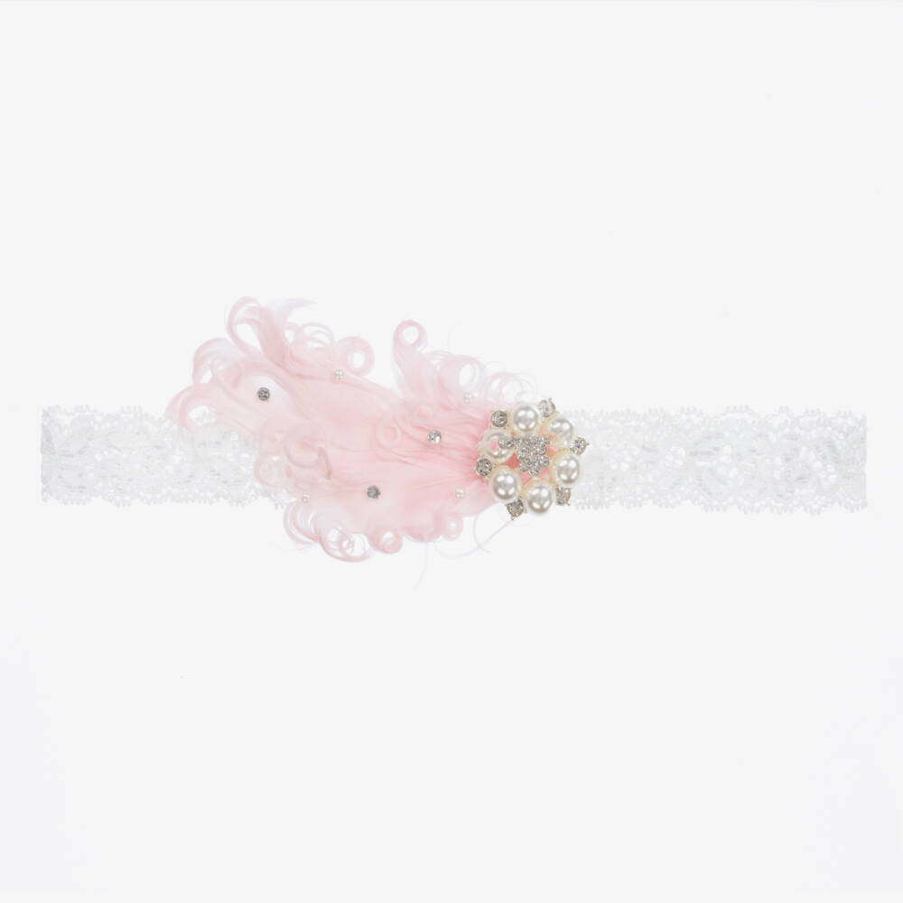 Baby girls ivory headband by Cute Cute. Soft and stretchy, this pretty hair accessory has a pearl and diamanté centre and a pink feather appliqué studded with gems.
