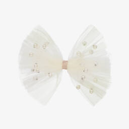 Girls lovely ivory tulle bow hair clip by Cute Cute. It has scattered faux pearl details, a shimmery beige centre and a crocodile clip fastening on the back.