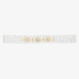 A sweet ivory headband for baby girls by Cute Cute, with pink satin roses and pearls on a stretchy elasticated lace band.