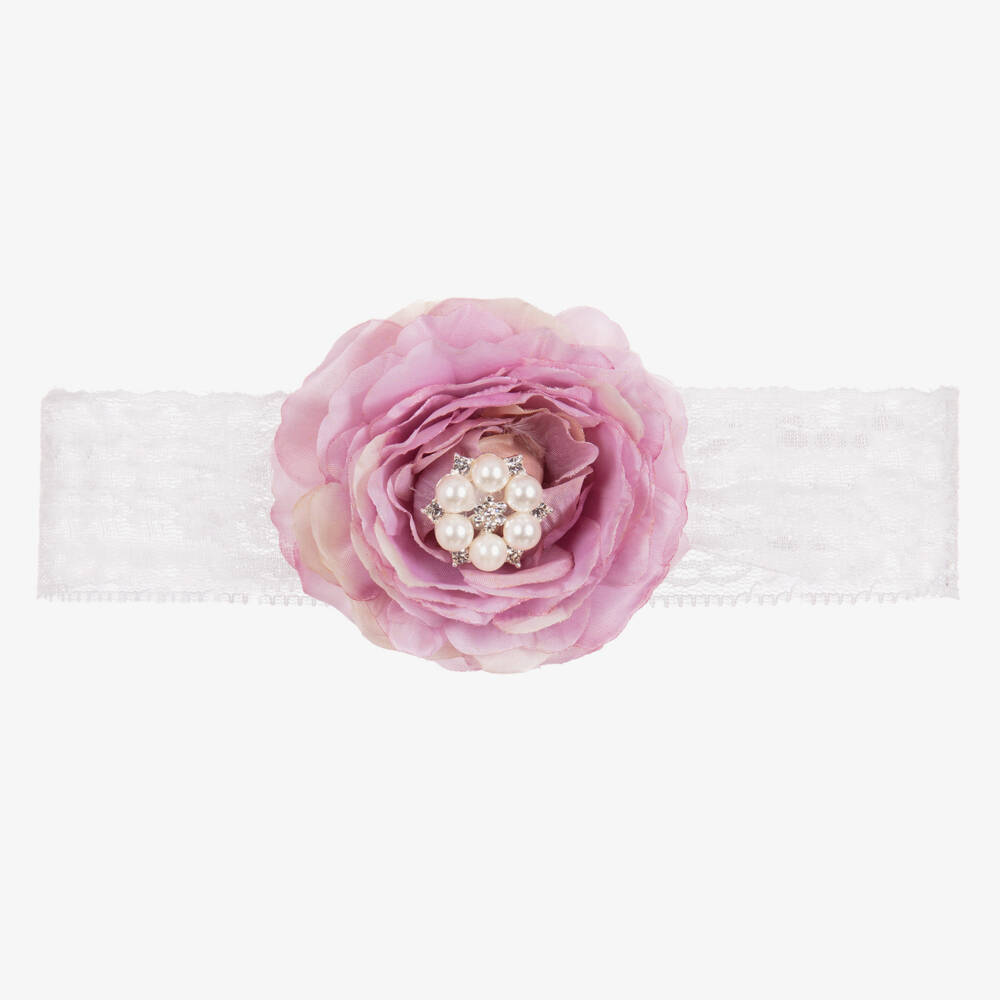Girls headband by Cute Cute, made with white silky lace and adorned with a lovely pink rose. Perfect for a special occasion, it has diamantés and pearl beads in its centre.