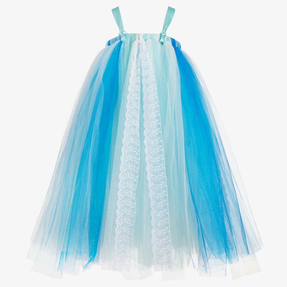A beautiful dress in shades of blue by Dainty Dizzy, made with varying lengths of individual hand-looped tulle. Lined in smooth satin, it has white embroidered lace trims and can also be worn as a skirt by removing the straps.