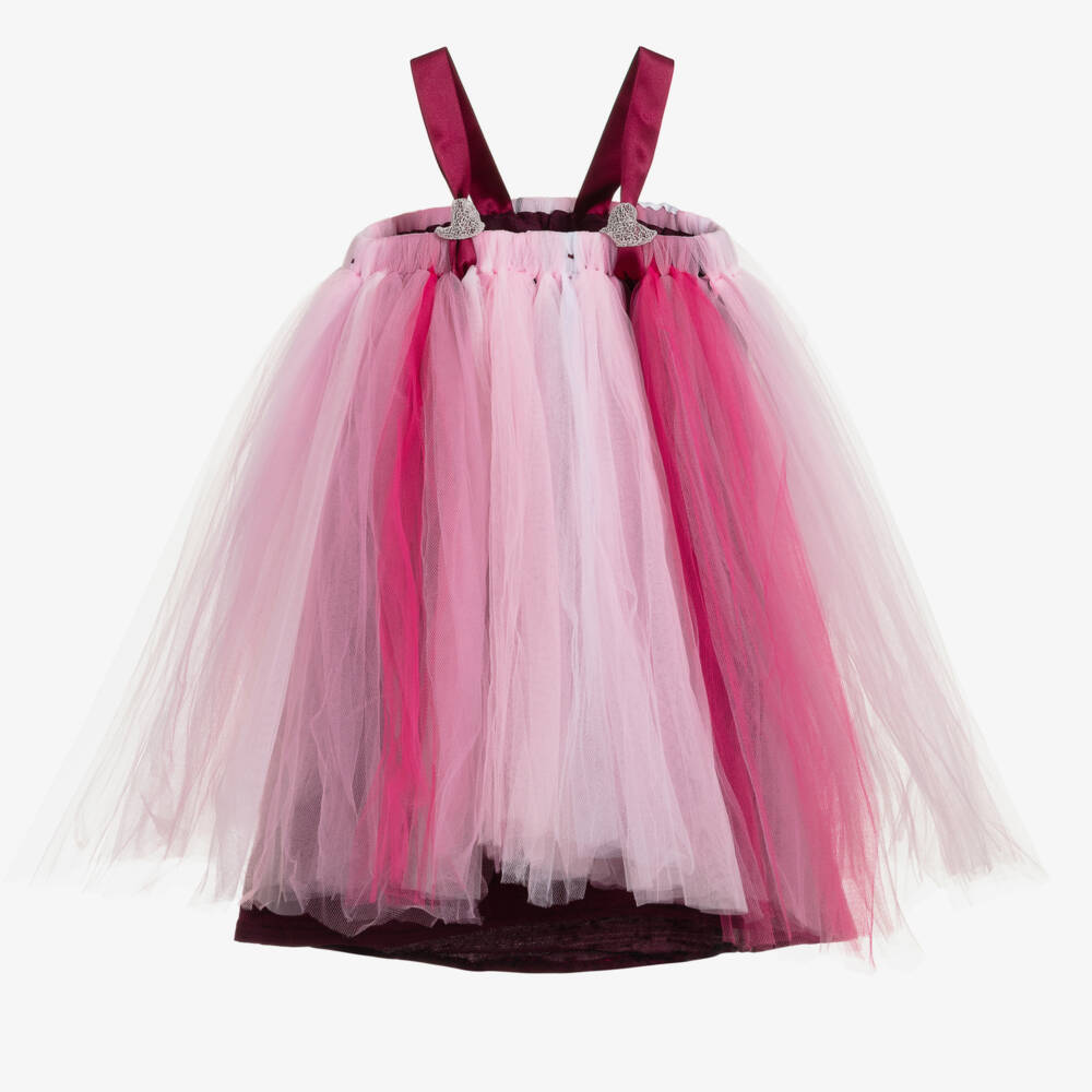 A beautiful dress in shades of pinks and purple for girls by Dainty Dizzy, made with varying lengths of individual hand-looped tulle. The purple silk taffeta lining is longer than the dress, and it can be worn as a skirt by removing the straps.