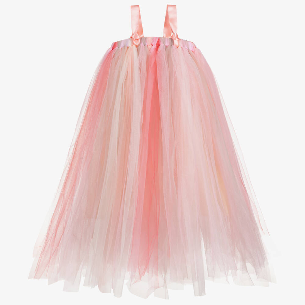 Hand made in England, a pink party dress is made by Dainty Dizzy. Layers and tones of pink tulle are sewn over a satin bodice and matching shoulder straps.