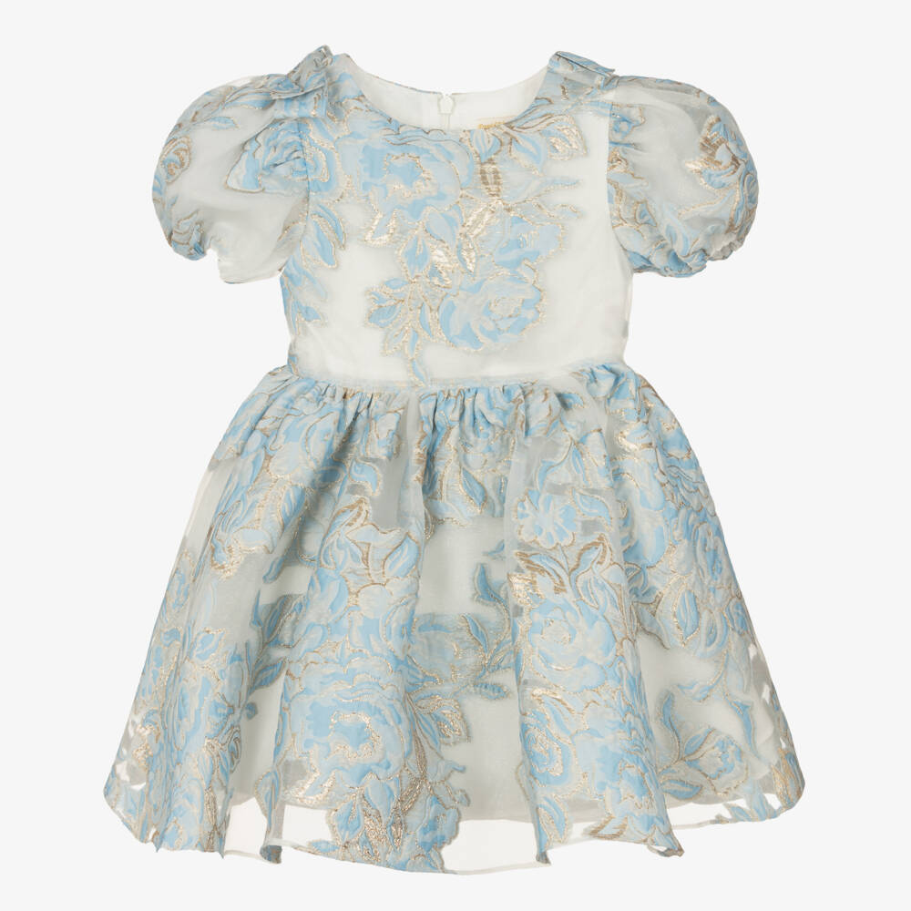 Light blue dress for girls by British brand David Charles, ideal for special occasions. Woven in luxuriously sheer organza with soft floral brocade detail and an elegant gold shimmer, it has dramatic puffed sleeves and lovely shoulder bows for a feminine finish. The back of the dress fastens with a concealed zip fastening for a chic, seamless fit. It has a silky and lightweight lining, providing little girls with comfort and added volume.