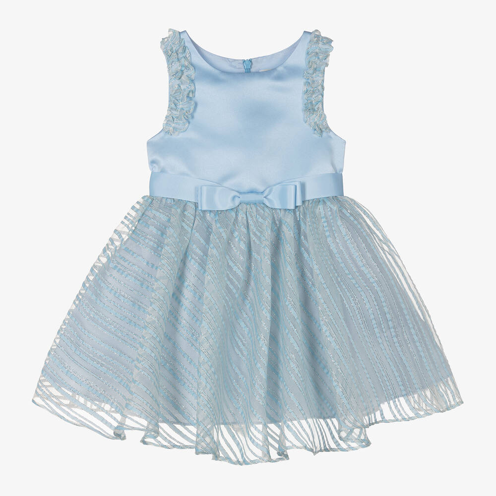 A fabulous occasion dress for girls by British designer David Charles, in complementary pale blue and sparkling gold. The sleeveless satin bodice is decorated with ruffled organza and a fixed bow for a stand-out look. With blue, gold and sheer stripes, the sumptuous skirt is lined with a layer of stiff tulle for volume and flounce. Lined with silky, comfortable fabric, this beautiful dress has a hidden zip and grosgrain ribbon sash to tie into a bow on the back.