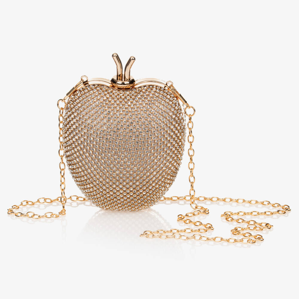 A beautiful apple-shaped, gold tone special occasion bag for girls by David Charles, covered in sparkly diamanté. It has shiny trims and a stalk-shaped snap fastening, with a small, satin-lined single compartment to carry a few essentials. This minaudiere style bag can be worn on the shoulder with the detachable chain strap or carried as a clutch for that glamorous finishing touch.