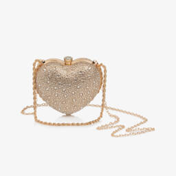 Sparkling gold rectangular bag for girls by David Charles, encrusted with dazzling diamantés. This special occasion bag has ivory satin trims and a small, ivory satin-lined main compartment with a golden metal snap clasp fastening. The detachable crossbody strap is made in a fine gold metal chain for a glamorous touch, great for adding a versatile carry option.