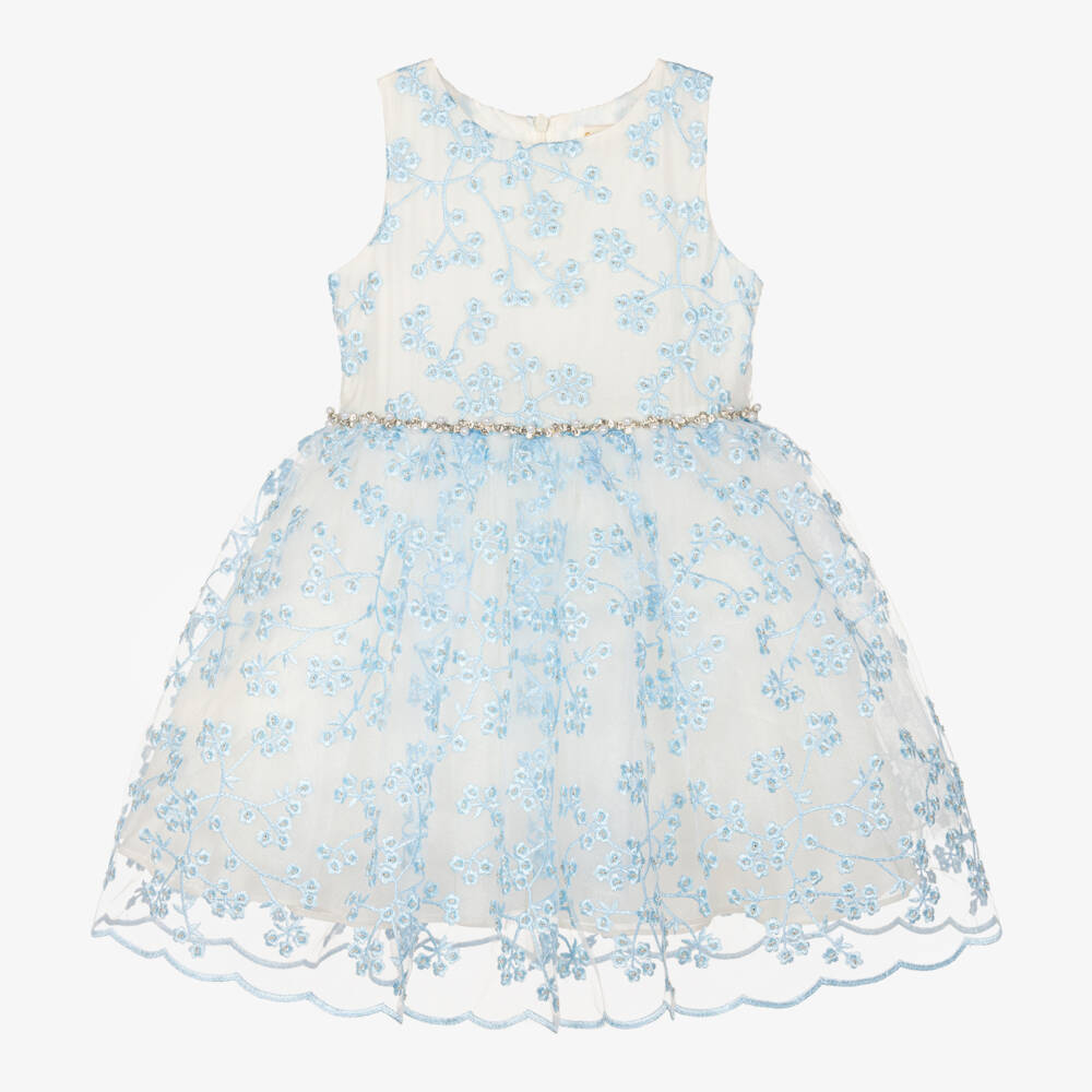 Stunning ivory special occasion dress for girls by British designer, David Charles. The fine, lightweight tulle is embroidered with delicate blue flowers, detailed with small shimmering beads for added sparkle. The sleeveless bodice has a gorgeous silver thread around the waist, with beautiful diamantés and faux pearls. The voluminous, full skirt shapes an effortlessly feminine silhouette, and is completed by a tie-up sash belt on the back of the waist. There is a concealed zip fastening on the back for a seamless illusion, and a soft silky lining for uncompromised comfort on special days.