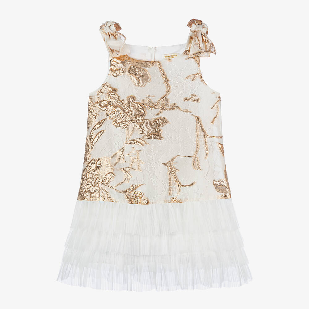 British occasion-wear label David Charles designs this stunning ivory and gold dress for girls. The soft, lightweight brocade fabric is designed with opulent metallic florals to shimmer in the light beautifully. It is trimmed with lovely tulle plissé on the hem and decorative bows on the shoulder straps. This sleeveless dress has a neat hidden zip on the back, a voluminous tulle underlayer, and a silky lining for lasting comfort.
