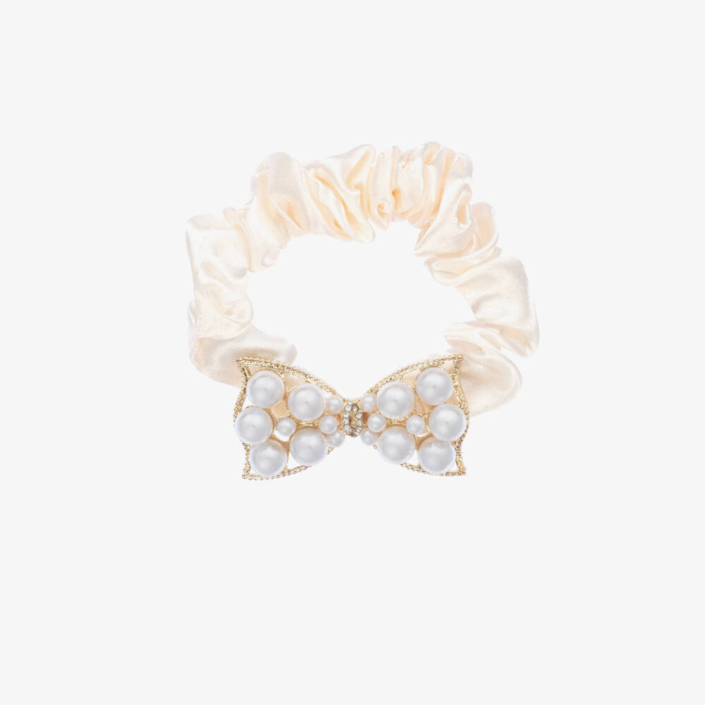 Ivory hair elastic for girls by British brand David Charles, made in silky soft satin. Great for accessorizing an outfit, the narrow scrunchie is decorated with a pretty bow-shaped motif. It is beautifully embellished with faux pearls and diamantés which are set in gold metal.