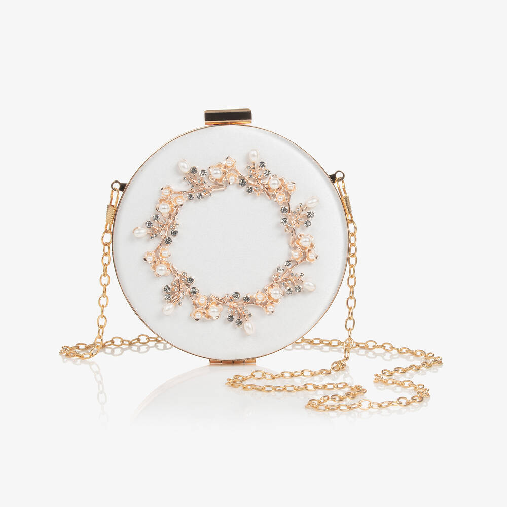 Absolutely beautiful, this ivory round box bag for girls is by David Charles. It has a rose gold, diamanté, and faux pearl floral wreath embellishment on the front for a romantic and glamourous look. Fastening with a snap clasp on the top, the small main compartment is satin-lined and has a golden metal chain strap that detaches to create a clutch bag.