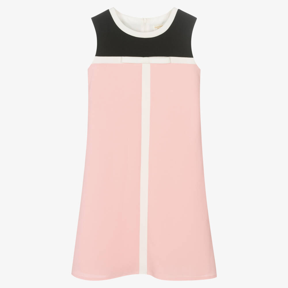 Stylish pink and black dress for girls, designed by British brand David Charles. Lovely for smart occasions, it has a 60's-inspired A-line shape and eye-catching white bow detail on the chest. It fastens smoothly with a concealed zip on the back for a seamless finish.
