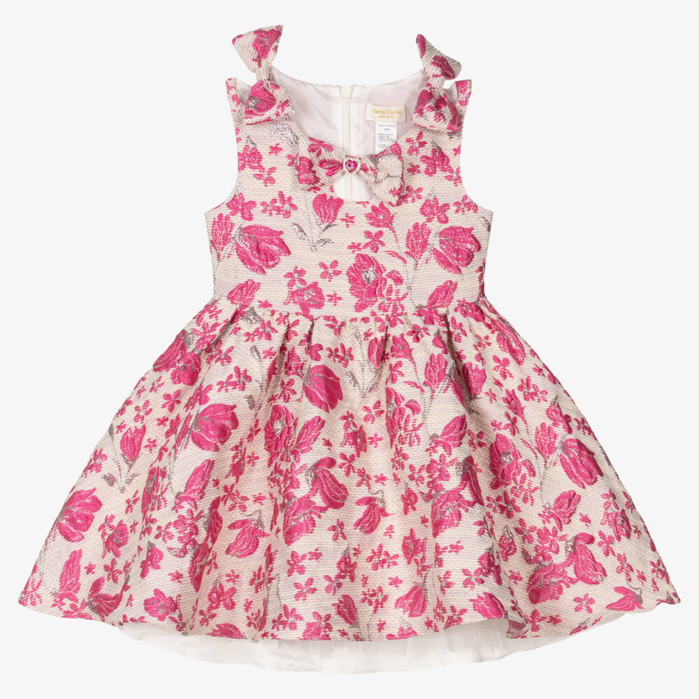 Beautiful pale pink special occasion dress for girls by British designer David Charles. It is made in richly decorative floral brocade with a fuchsia pink and shiny silver floral pattern in the weave. There are fixed bows on the shoulders and another on the front of the bodice, decorated with a pink crystal and sparkly diamanté heart. The full, gathered skirt has tulle frills on the satin lining for extra swish and volume. The dress fastens with a neat, concealed zip around the back, with ties that fasten in a large bow.