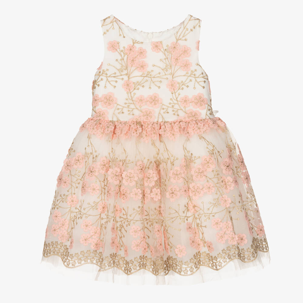 Gorgeous white tulle dress for girls by British designer David Charles, just right for a special occasion. Exquisitely embroidered and appliquéd with pink and gold flowers, it is lined in layers of satin for comfort, and tulle for wonderful volume. Around the back, it fastens with a neat, concealed zip and a sash that ties in a bow.