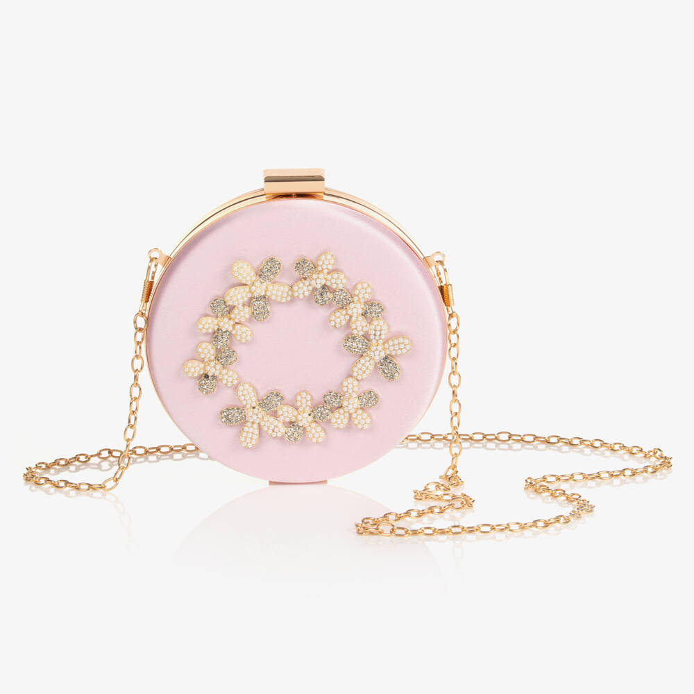 An elegant pale pink satin round-shaped bag by David Charles. Beautiful for special occasions, the front is decorated with faux pearl and rhinestone encrusted flower garland on a golden metal setting. This minaudière style bag has a small, rigid compartment with gold metal frames, satin lining, and a snap clasp closure. It can be worn as a clutch bag or over the shoulder with the removable golden chain strap for a different look.