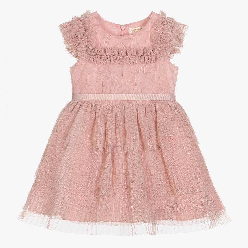 A special occasion pink dress for girls by British brand David Charles. Made in layers of soft tulle, there are lovely plissé ruffles on the bodice and skirt. It has a removable grosgrain ribbon sash on the waist, a silky lining with layers of tulle for added volume, and a zip fastening on the back