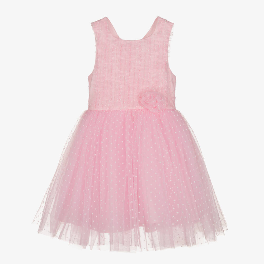 Light pink occasion dress for girls from British label David Charles. Designed with white flocked polka dots, the beautifully soft tulle overlay is stitched in ruffles across the fitted bodice, and falls beautifully from the waist. Smart and timeless, the waist is detailed with a fabric rose, and ties on the back with tulle ribbons. The skirt is lined with layers of stiff tulle for volume and silky satin for comfort.