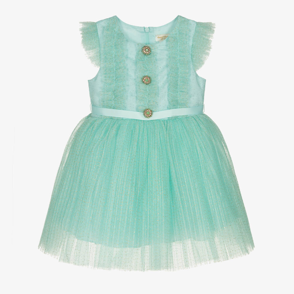 Girls stunning turquoise blue dress by British designer, David Charles. A lovely dress for parties and special occasions, it has a tulle overlay sprinkled with gold glitter for a sparkly effect. The fitted bodice has ruffle trims and three jewelled decorative buttons. There is a removable grosgrain ribbon belt that ties in a bow on the back. The full and flared skirt has tulle underskirts for volume and it is fully lined for comfort, with a concealed zip on the back.