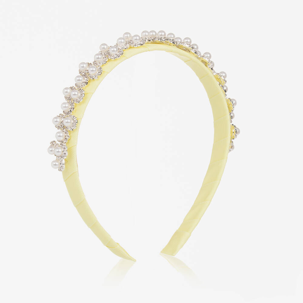 A pretty pale yellow hairband for girls by David Charles, beautifully wrapped in grosgrain ribbon. Set on a flexible band, this hair accessory is embellished with faux diamantés and pearls for an eye-catching look.