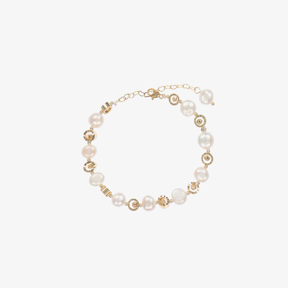 Gold metal bracelet for girls by British designer David Charles. This glittering gold jewellery piece is adorned with ivory pearls and gold crystals, encased in gold metal circular beads. The lobster clip fastening is adjustable with a heart-shaped chain for a good fit.