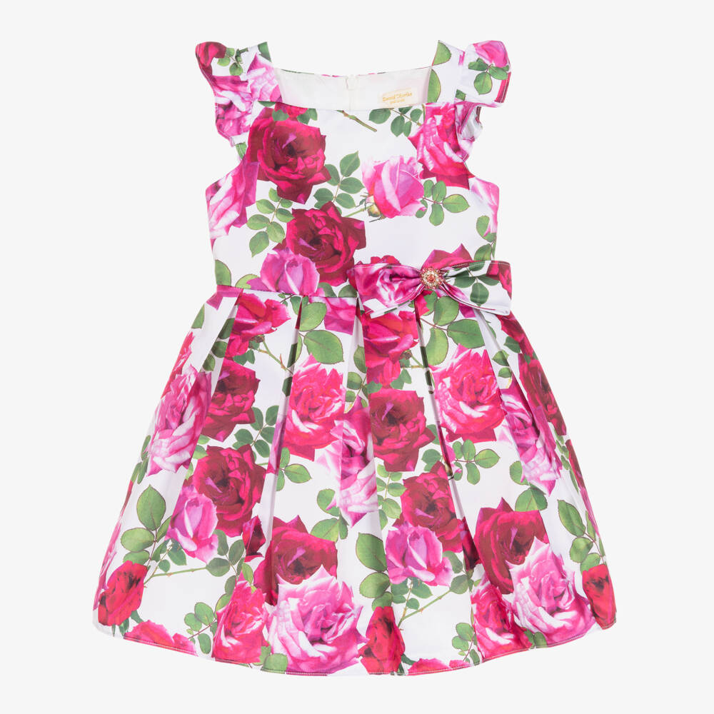 Stunning white satin dress for girls by British brand David Charles, in a bold pink and green rose pattern. It is chic and elegant with a square neckline, little flutter sleeves and a box-pleated skirt, finished off with the sweet, rhinestone-encrusted bow on the waist. The silky smooth and lightweight lining has a stiff tulle trim around the hemline for a voluminous skirt. It fastens with an invisible zip on the back for a neat look.